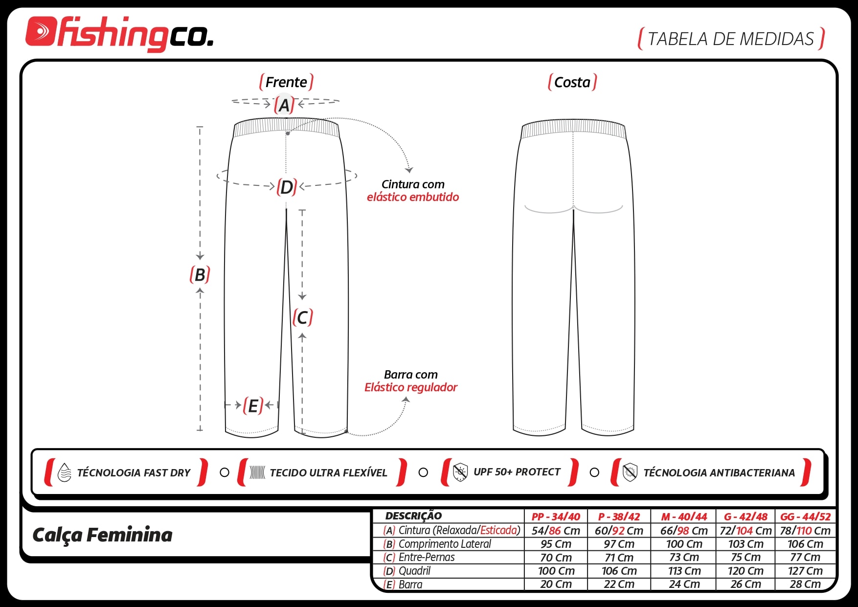 Calça feminina com bolsos, especialmente desenvolvida para atividades outdoor. As calças Fishing Co. tem proteção solar permanente UPF20.