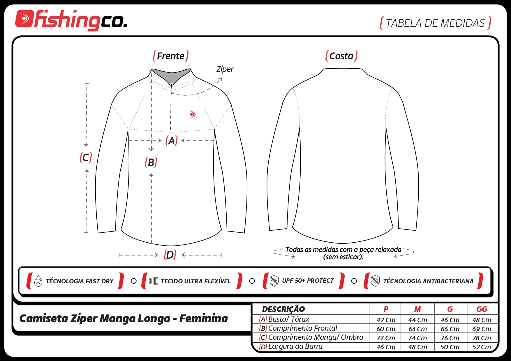 Camiseta manga longa com zíper feminina Fishing Company. Ideal para uso no dia a dia, práticas esportivas ou quando longa exposição ao sol.